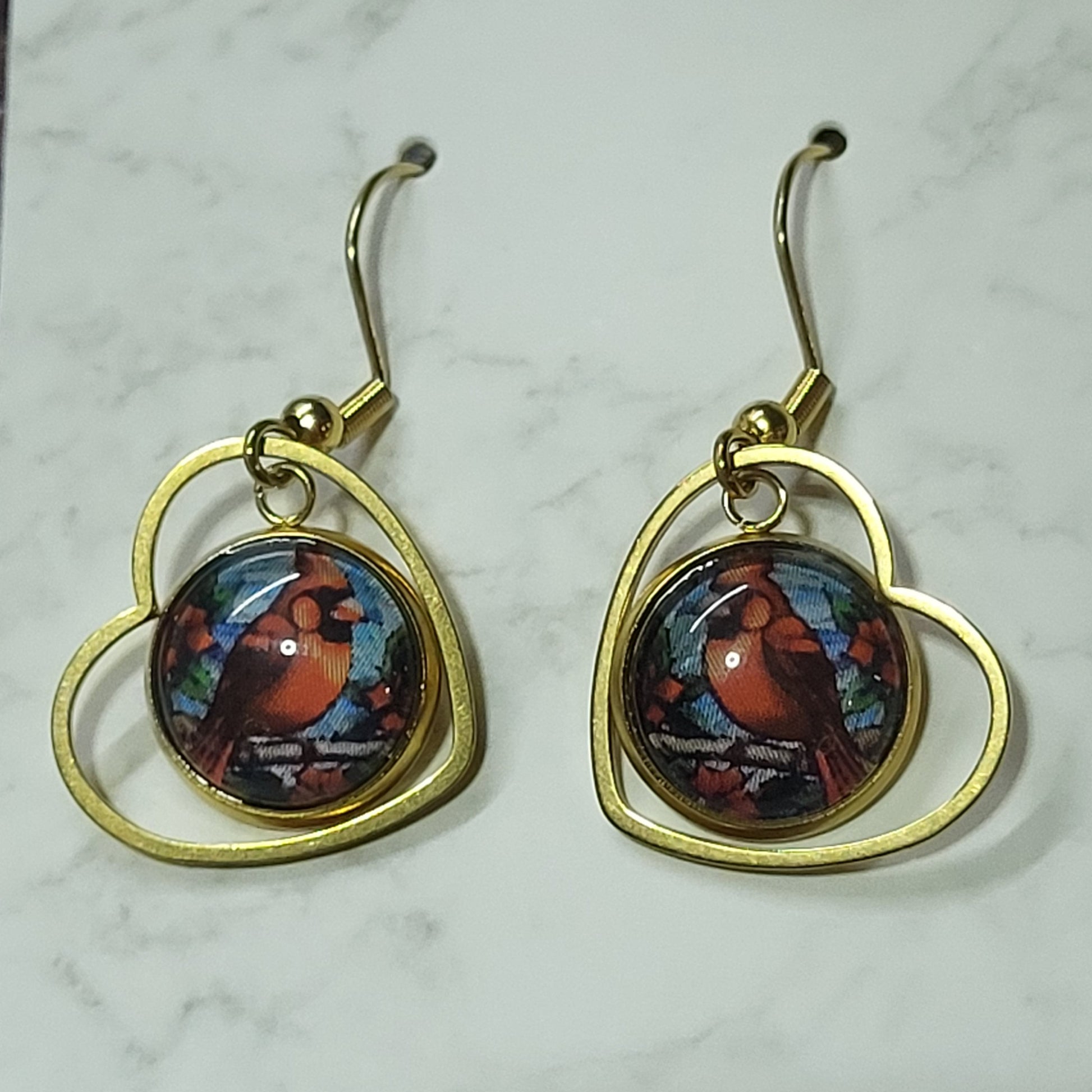 Each earring showcases a beautiful glass cabochon featuring a festive robin with its signature red breast perched among winter branches. The circular cabochon is elegantly framed by a delicate gold-tone heart-shaped setting that adds romantic charm. The cardinals vibrant colors and detailed artwork make these earrings a delightful conversation piece.