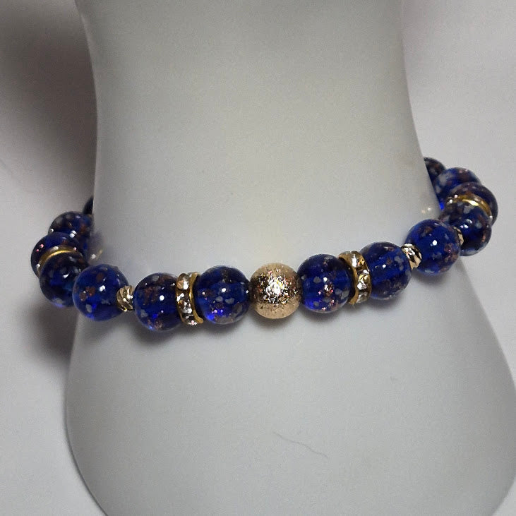 Each stretch bracelet is lovingly handmade with premium cobalt blue glass beads that radiate depth and brilliance. The elastic stretch design ensures comfortable, one-size-fits-most fit. The gold dust sparkle creates a luxurious contrast against the deep blue, making this piece truly eye-catching.