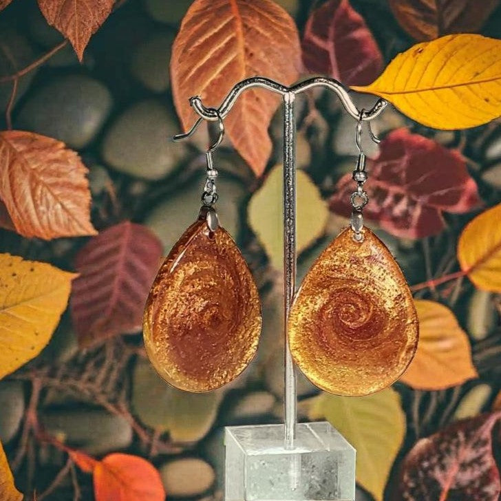 The Crimson Swirl earrings from our Touch of Autumn Collection showcase the mesmerizing beauty of swirled resin artistry. Handcrafted with a stunning blend of gold, bronze, and copper, these elegant teardrop dangle earrings feature a unique swirled pattern that captures the dynamic movement and rich warmth of the autumn season.