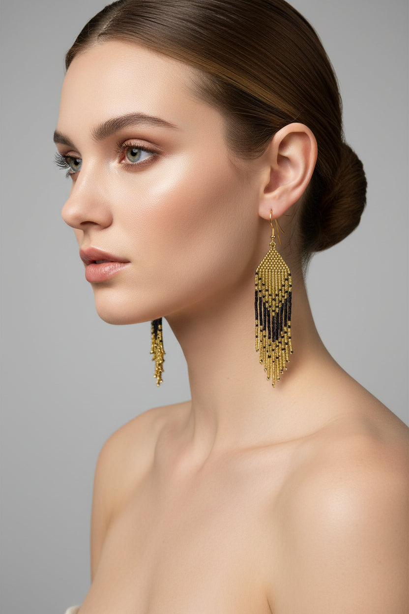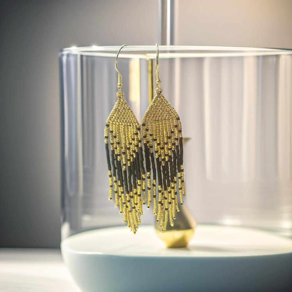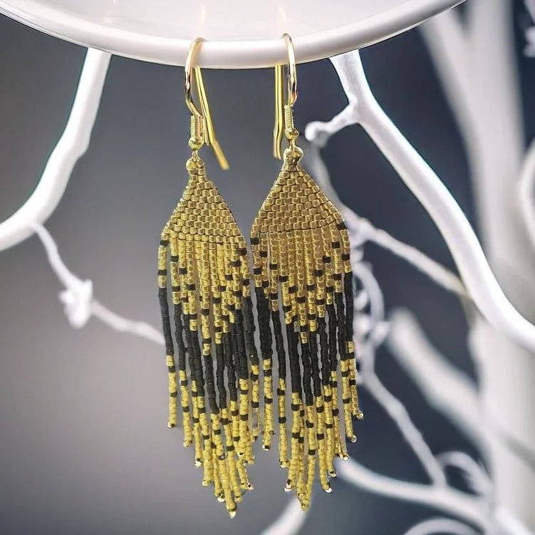 Flaunt your fashion sense with these jaw-dropping Gold Digger earrings. Every inch of these stunners is meticulously handcrafted using traditional Japanese glass seed beads sewn together one precious bead at a time. The result? Luxurious gold and black dangle fringe that cascades with effortless glamor. Whether heading to the office or painting the town, these earrings make an unforgettable statement. Get ready to turn heads and field endless compliments from jealous admirers - these Gold Diggers are about to become your new signature accessory.