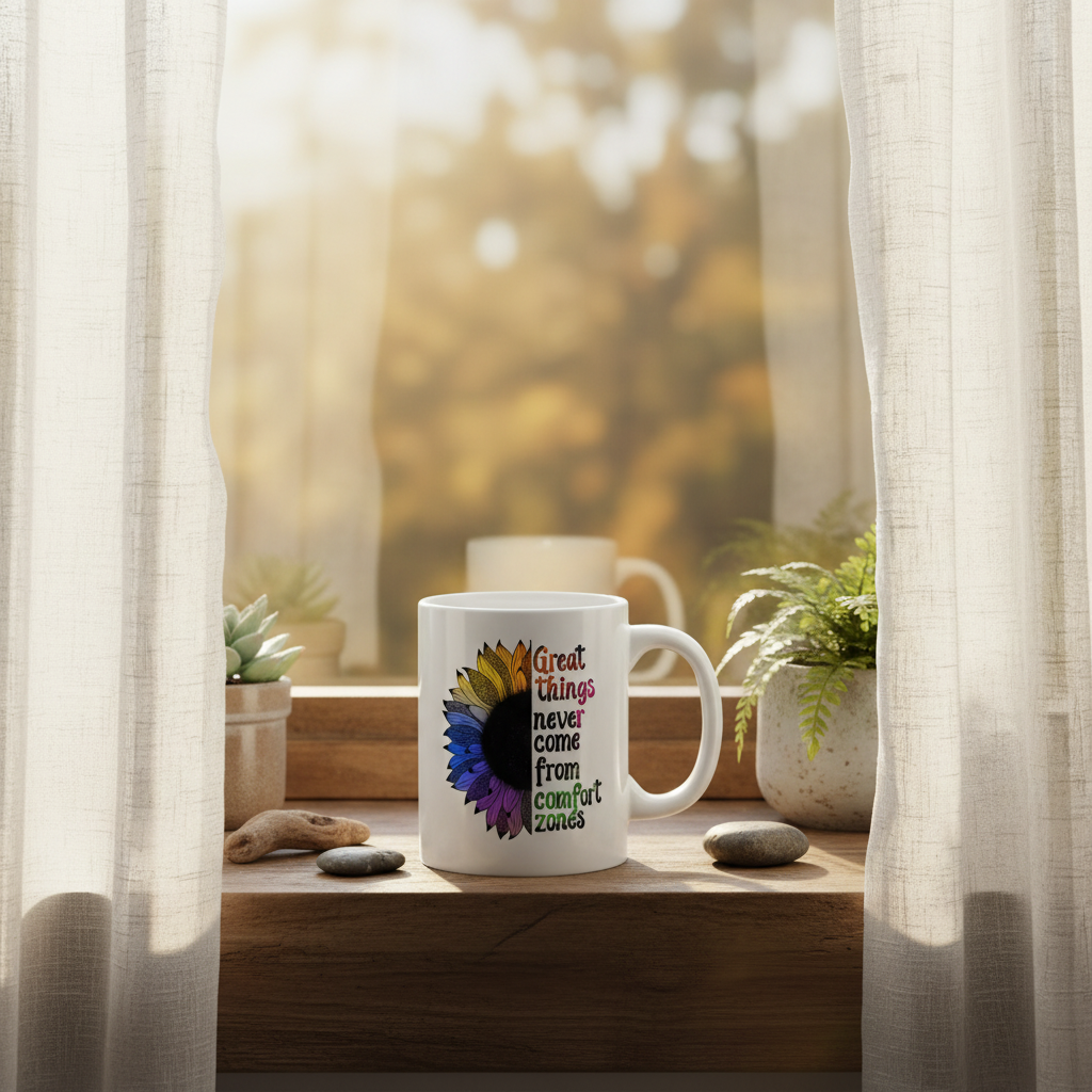 Challenge yourself to grow with our "Great Things Never Come from Comfort Zones" mug. This striking ceramic piece features a bold rainbow sunflower design paired with a powerful reminder that true achievement requires courage, risk, and the willingness to venture into the unknown.