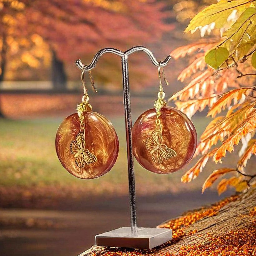 The Harvest Moon earrings from our Touch of Autumn Collection capture the magic of fall with their elegant round dangle design. Handcrafted with a beautiful blend of gold, bronze, and copper resin, these earrings glow with the warm, rich tones of autumn's golden hour.