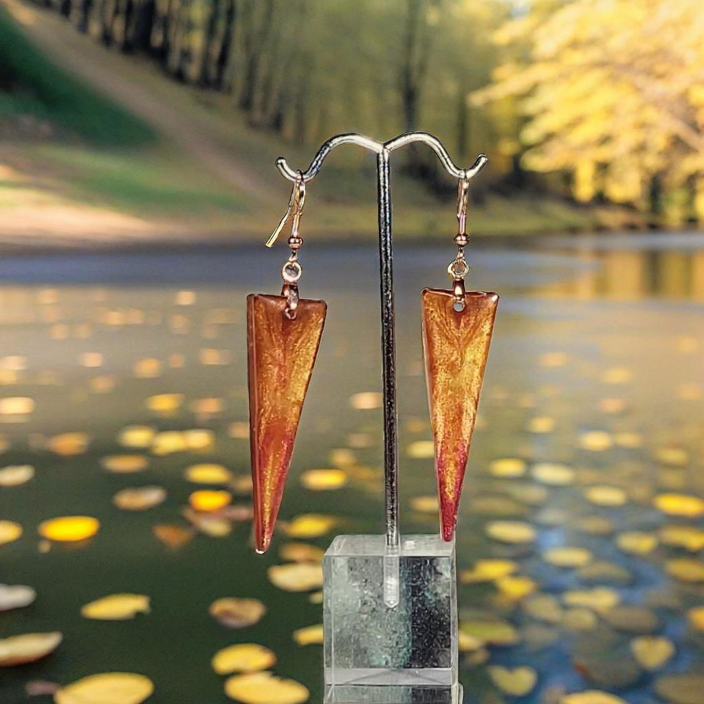 The elongated inverted triangle shape creates a modern, geometric look that's both striking and sophisticated. The blended metallic hues flow seamlessly through each earring, creating depth and visual interest that shifts beautifully in the light. This unique combination of bold shape and warm autumn colors makes these earrings a true statement piece.