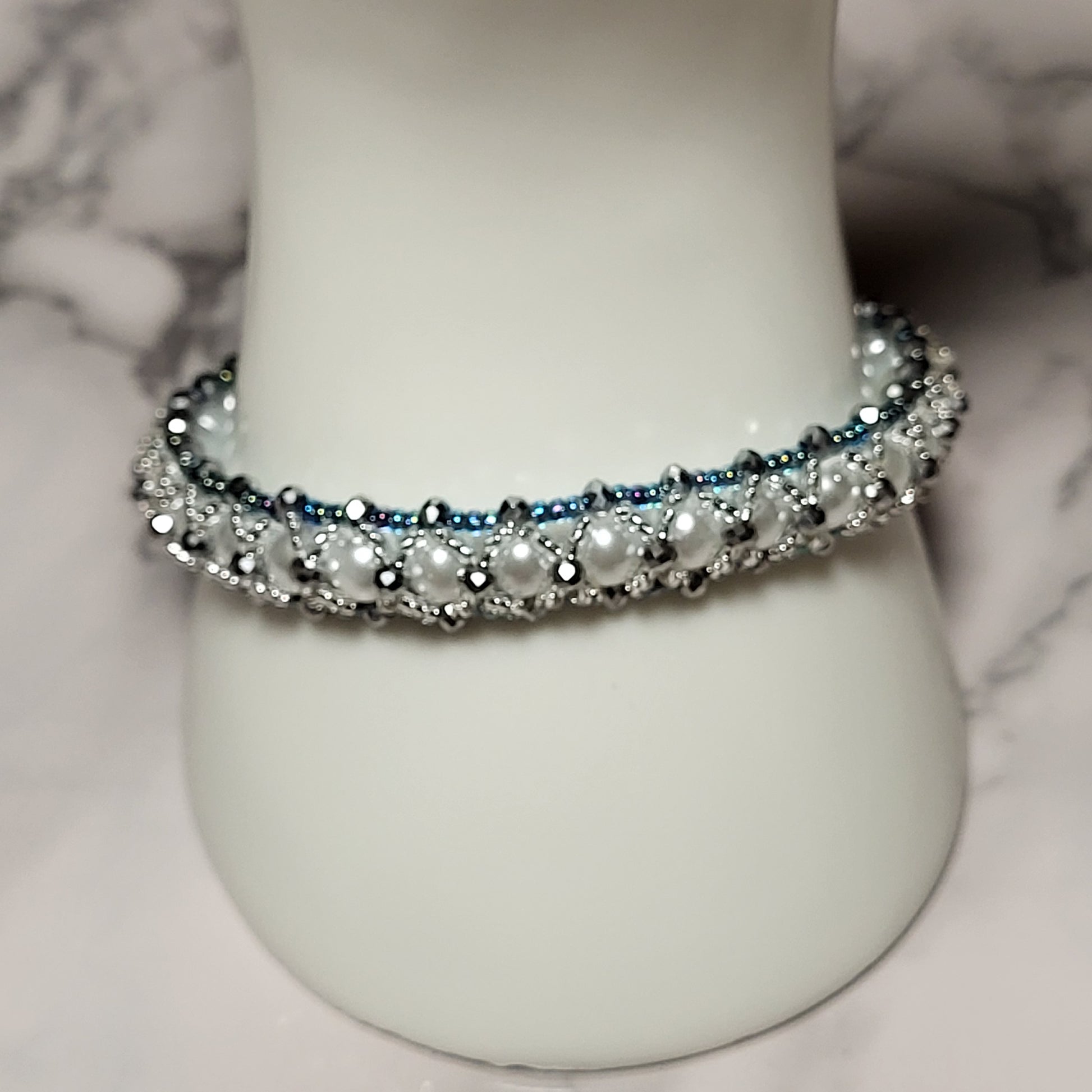 Embrace the enchanting elegance of winter with this exquisite handcrafted beaded bracelet. Inspired by the crystalline beauty of freshly fallen snow, this piece captures the magic of a winter wonderland with its luminous palette of white pearls and sparkling silver crystals.