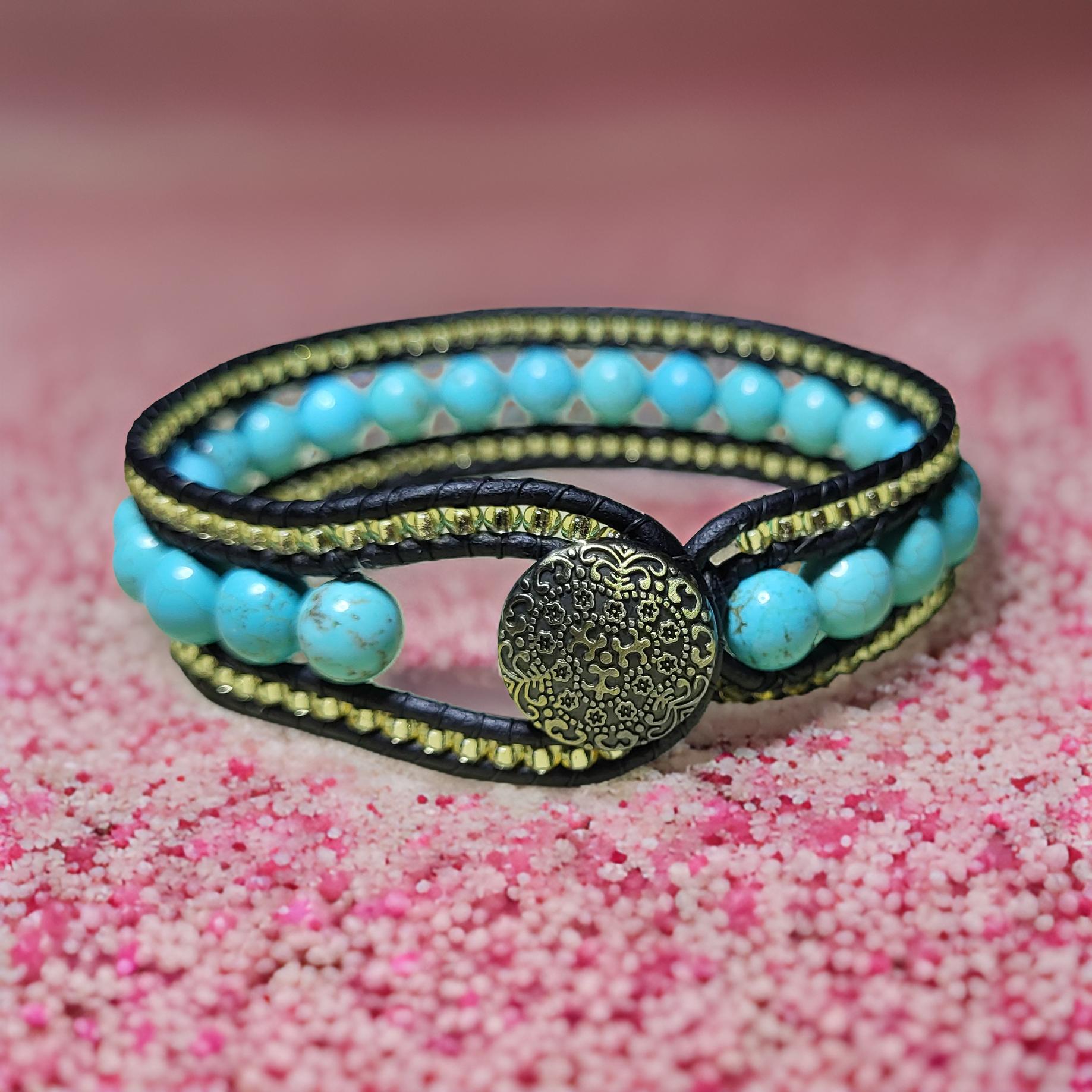 Embrace the beauty of natural gemstones and artisan craftsmanship with this unique turquoise and leather cuff bracelet.